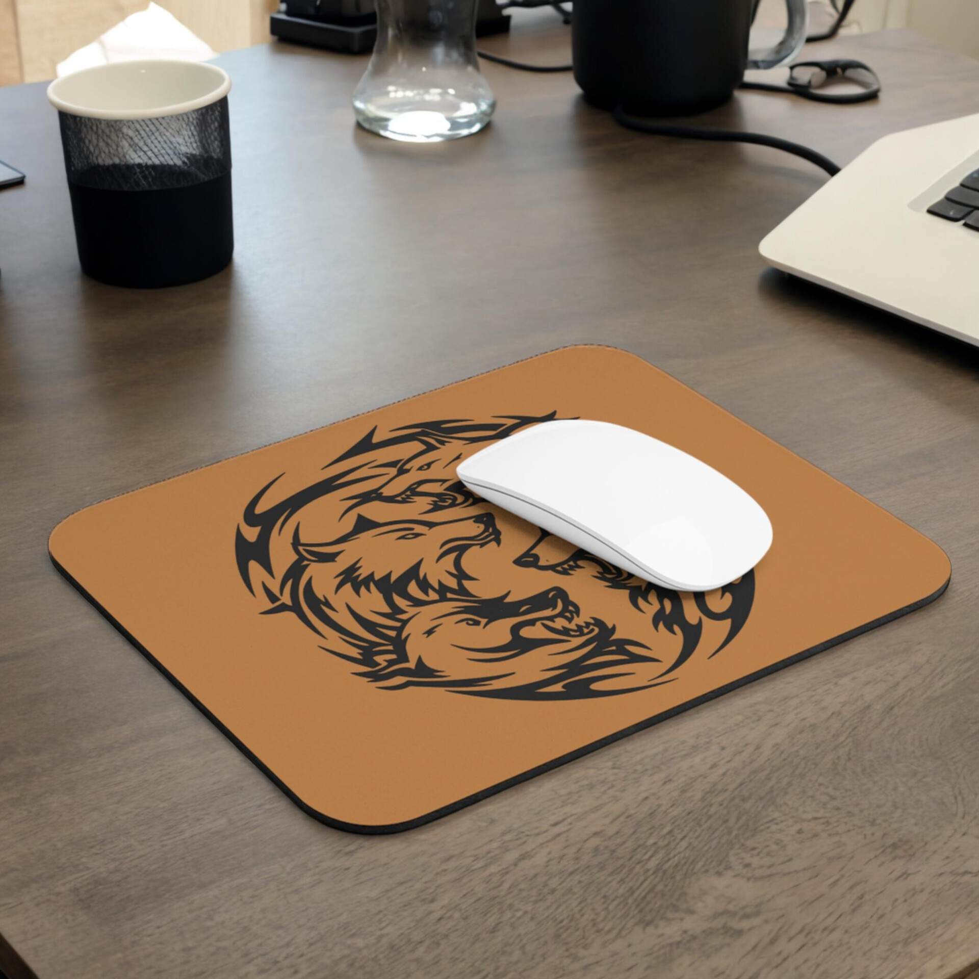 Alpha’s Embrace is a non-slip mouse pad featuring a bold, tribal-inspired design of four wolf heads intertwined in a powerful circular formation. Set against a rich brown background, the striking black artwork captures the fierce spirit and unity of the wolf pack, making this mouse pad both a functional accessory and a statement piece for any workspace.
