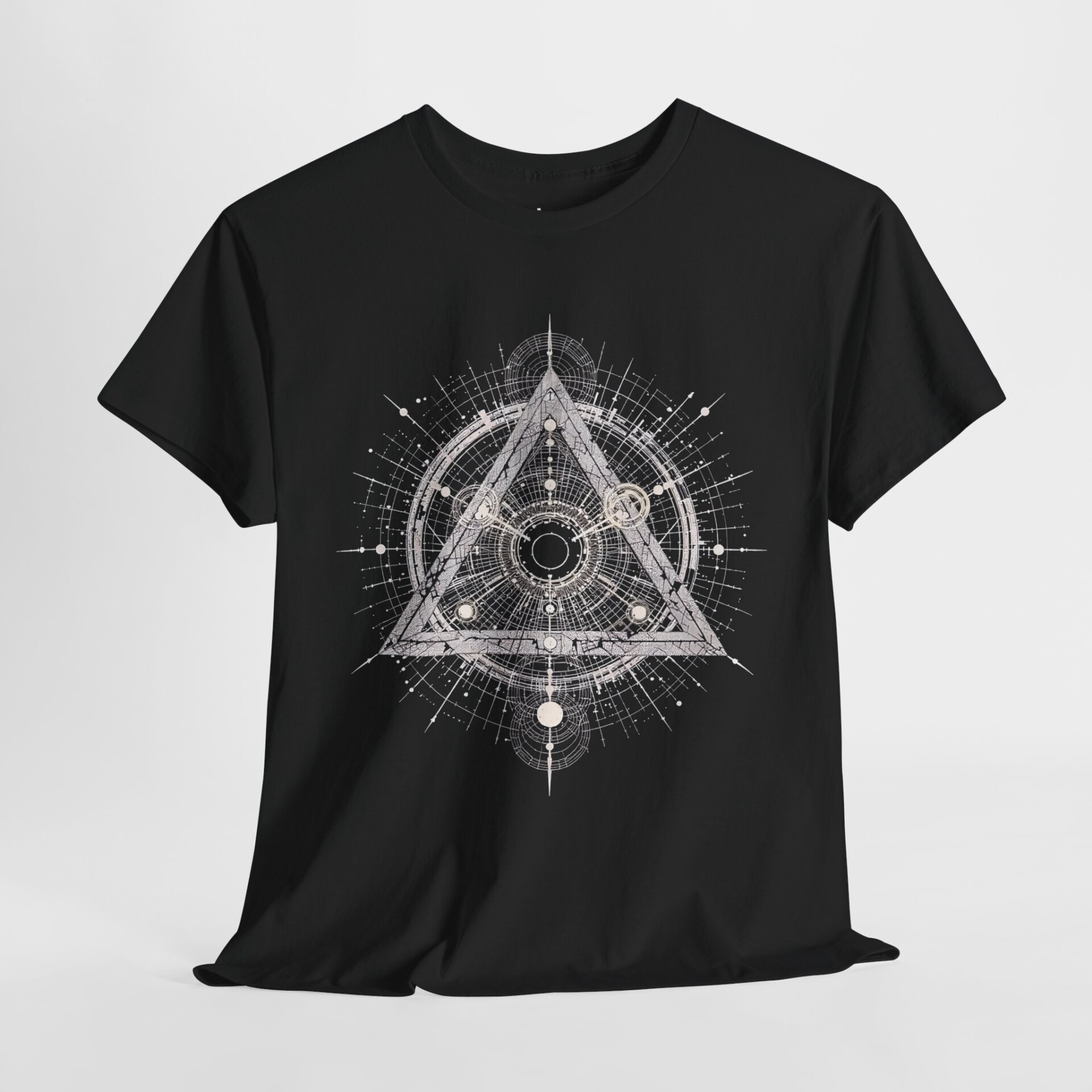Unlock the mysteries of the universe with the Celestial Schematic graphic tee! Made from ultra-soft, 100% cotton and featuring a comfortable tagless neckline, this shirt boasts a mesmerizing blueprint-inspired design—a fusion of intricate geometric lines, cosmic symbols, and orbiting spheres at the heart of a radiant triangle. The monochromatic artwork evokes themes of discovery, balance, and cosmic order, perfect for stargazers, seekers, and fans of sacred geometry.